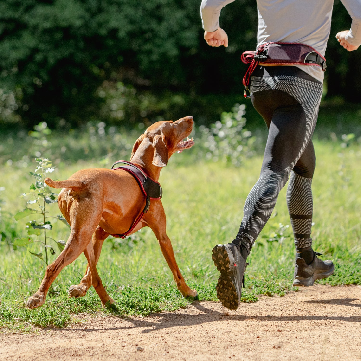 ROGZ AirTech Sport Harness, it is quick and easy to fit. The belay loop on the harness allows for a lead attachment and when used with AirTech leads, the carabiner slides side to side for freedom of movement for both adventurer and fur companion.